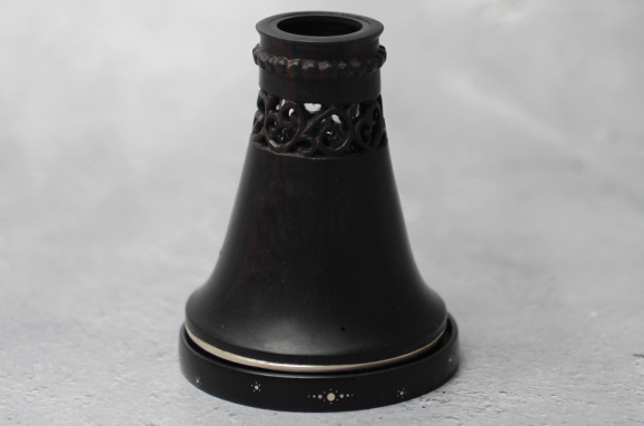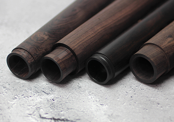 さらに今ある貴金属(プラチナ、金、シルバー)に続く「軽く、自由な造形が可能な素材、使用に耐えうる素材、手頃な販売価格」の条件を満たし、高級感のある素材を思案していたところ、「クラリネットは黒檀で作られている」と知り、グラナディラという木材をにたどり着きました。グラナディラはとても硬く、更に艶がでて、他の木材にはない色、高級感があります。